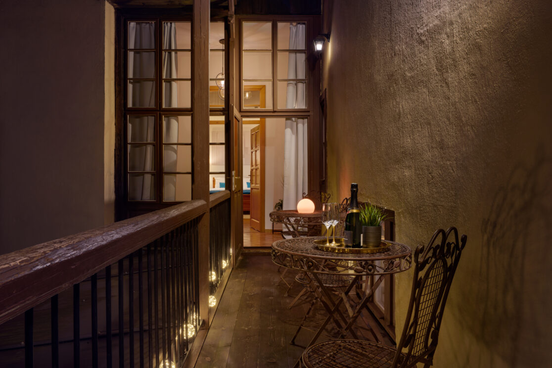 Our largest double room with a balcony offers spacious and comfortable accommodation, ideal for couples seeking a peaceful retreat in the center of Český Krumlov. The room is furnished with a large double bed, a modern bathroom, a TV, a writing desk, a spacious wardrobe, and two comfortable armchairs for relaxation. A private balcony adds a pleasant outdoor space for sitting and enjoying the surroundings. The interior combines functionality with simple elegance, ensuring a pleasant stay throughout all seasons.