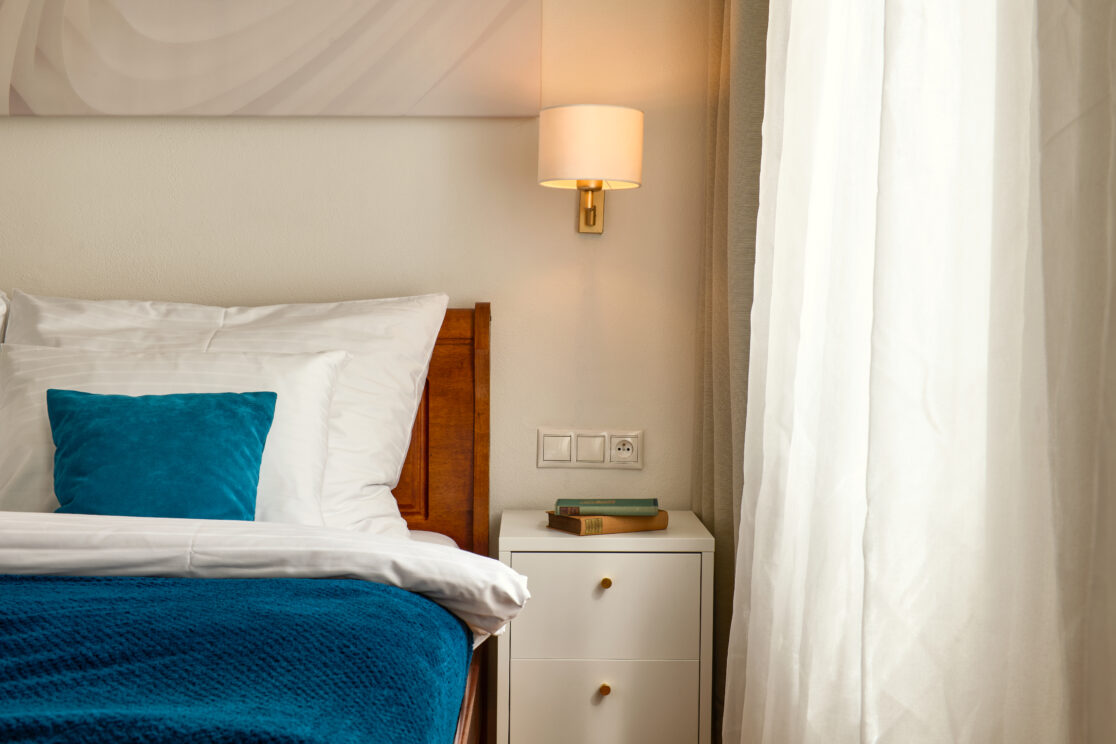 The double room offers comfortable accommodation with a modern bathroom, a spacious wardrobe, a comfortable double bed, a TV, and an elegant table with two chairs. The windows provide a pleasant view of the picturesque Latrán Street, adding to the unique atmosphere of your stay.