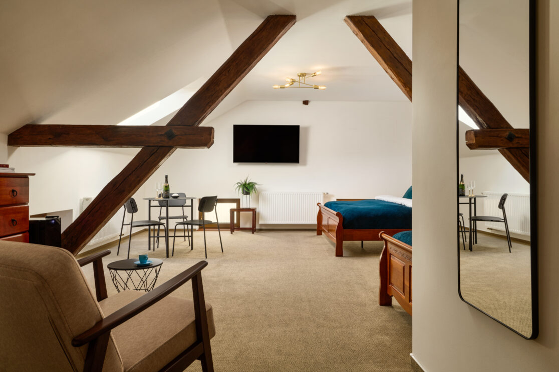 The triple room is equipped with a spacious bathroom with a shower, a wardrobe, two comfortable armchairs, and a skylight that provides pleasant natural light. Thanks to its thoughtful layout and ample space, it is ideal for small families or groups of friends looking for a quiet and comfortable accommodation.
